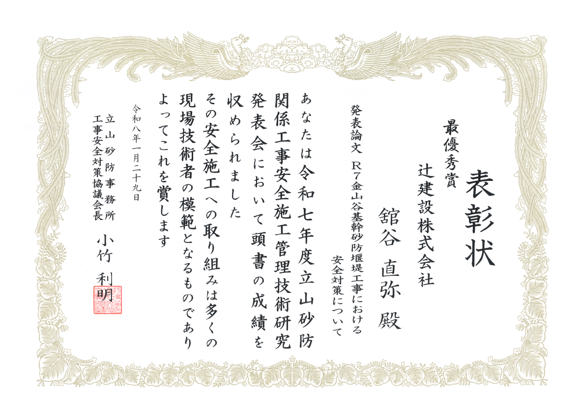 今回最優秀賞を受賞した社員は若手社員で、昨年の砂防工事では先輩社員の指導のもと一生懸命取り組みました。